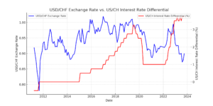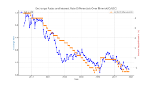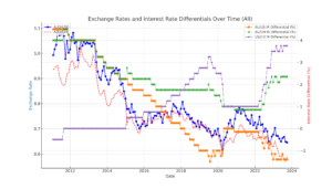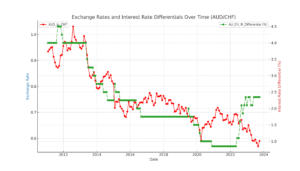 Have a look at Chart 1, which shows the Exchange Rate values and Interest Rate differentials between Australia, the US, and Switzerland (currency shown in $AU terms and interest rates as differentials between Australia and the respective country). Now, imagine you are a global currency manager back in 2011 or 2012, and you are comfortable that the risk of these three countries going broke is small enough to ignore. By holding $AU as your preferred currency, you could have got an extra 4% on your deposits.